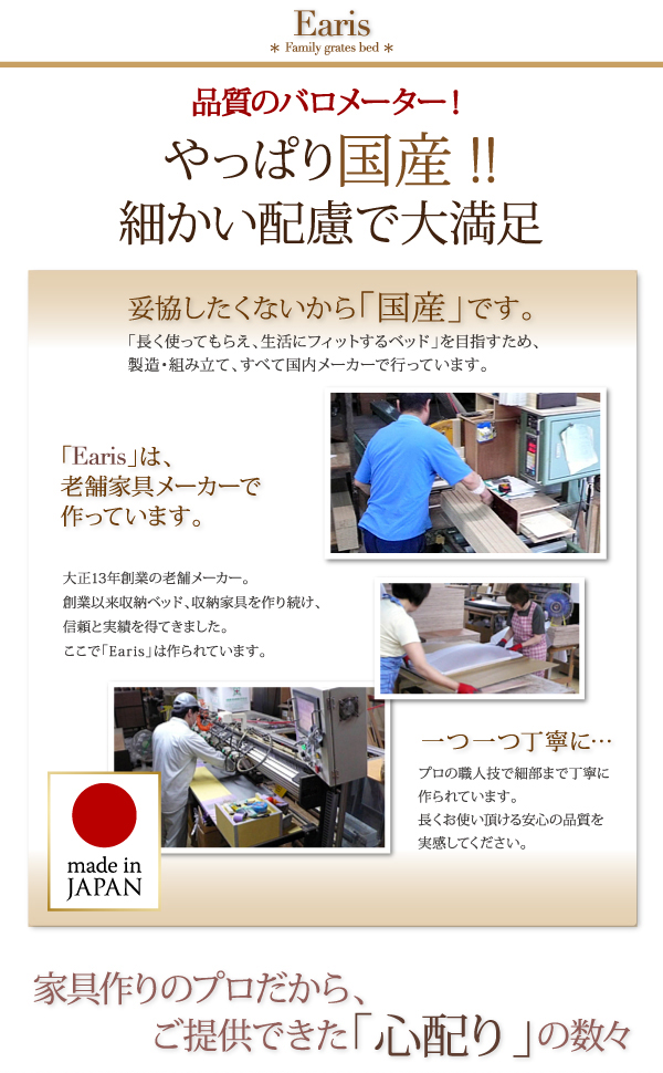 「長く使えて、生活にフィットするベッド」を目指し、製造・組み立てを全て国内メーカーで行っています。