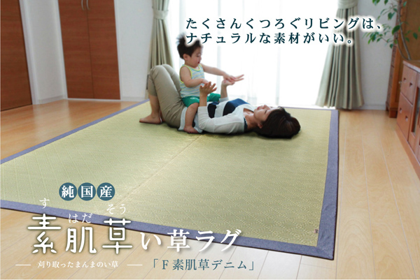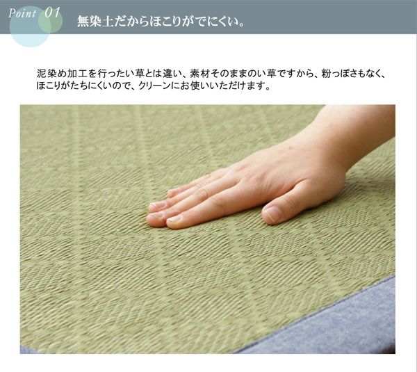 無染土(泥染めをしていない)のイ草を使用したカーペットです。通常、イ草製品の製造工程にイ草の乾燥を速める為やイ草の織機にイ草が通りやすくする為、お客様のお手元に届くまでの日焼け防止などの為に『泥染め』という工程があります。本商品はイ草自体の質の良さ、肌触りにこだわり、泥染めをしておりません。しないことによりスベスベとした、非常に気持ちの良い肌触りを実現しました。泥染めという工程を省くと、乾燥、生地を織るなどの工程も非常に難しくなります。熟練した職人さんしか織れませんし、非常に手間暇のかかる逸品です。国産(九州産)のい草を使用しています。一本一本が太く、表皮が厚く繊維がキメ細かいので弾力性があり、耐久性に優れています。い草には空気の自然浄化作用、湿度の調節作用などがあります。また汚れにくく、使用するうちに黄金色に変化し味が出ます。