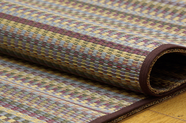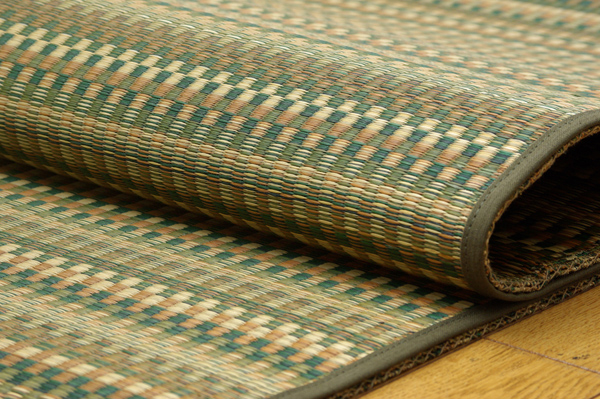 多色を使いながらも落ち着いた雰囲気に仕上げたイ草カーペットです。ベージュ、ブルー、ブラウン、グリーンの4色展開です。お部屋に合わせてお好きな色をお選び下さい。国産(九州産)のい草を使用しています。一本一本が太く、表皮が厚く繊維がキメ細かいので弾力性があり、耐久性に優れています。い草には空気の自然浄化作用、湿度の調節作用などがあります。また汚れにくく、使用するうちに黄金色に変化し味が出ます。い草に青森ヒバ加工を施しています。(抗菌、防臭効果)