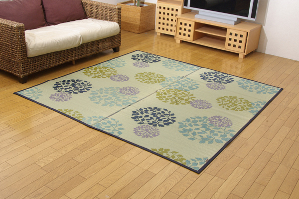 縦糸の本数が多い袋織りという技法で繊細な柄を出しています。折れ曲がりが複雑なので長いイ草を使用しないと切れてしまいます。縦糸が密なので、しっかりとして破れにくいのが特徴です。国産(九州産)のい草を使用しています。一本一本が太く、表皮が厚く繊維がキメ細かいので弾力性があり、耐久性に優れています。い草には空気の自然浄化作用、湿度の調節作用などがあります。また汚れにくく、使用するうちに黄金色に変化し味が出ます。い草に青森ヒバ加工を施しています。(抗菌、防臭効果)