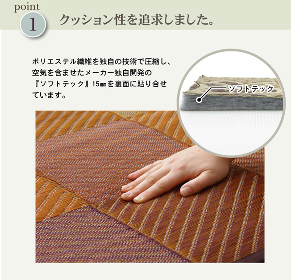 クッション性を追求したボリュームタイプ(メーカー比約3倍)のカーペットです。裏地にはソフトテックというポリエステル素材を使用しています。ポリエステル繊維を、メーカーが新たに開発した独自の技術で圧縮し、通気性を保ちつつ、圧倒的なクッション性をのある素材に仕上げました。軽量床衝撃音低減性能LL(1)-8を取得しており、床下への騒音を軽減する効果もあります。表生地は縦糸の本数が多い袋織りという技法で繊細な柄を出しています。折れ曲がりが複雑なので長いイ草を使用しないと切れてしまいます。縦糸が密なので、しっかりとして破れにくいのが特徴です。国産(九州産)のい草を使用しています。一本一本が太く、表皮が厚く繊維がキメ細かいので弾力性があり、耐久性に優れています。い草には空気の自然浄化作用、湿度の調節作用などがあります。また汚れにくく、使用するうちに黄金色に変化し味が出ます。い草に青森ヒバ加工を施しています。(抗菌、防臭効果)