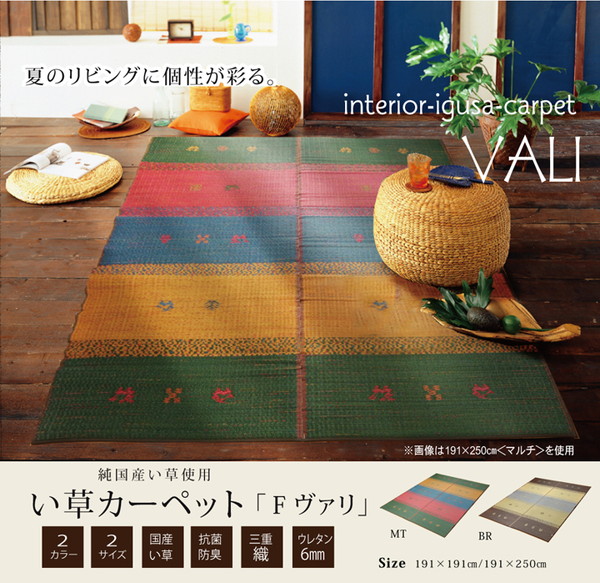 ウィルトンカーペットのような幾何柄でカジュアルなデザインのい草ラグカーペットです。フローリングでもご使用できるよう、裏地にはウレタンフォームを使用しているためクッション性のある商品です。洋室にも合いやすいように柄はカラフルで明るく、シンプルなものにしました。国産(九州産)のい草を使用しています。一本一本が太く、表皮が厚く繊維がキメ細かいので弾力性があり、耐久性に優れています。い草には空気の自然浄化作用、湿度の調節作用などがあります。また汚れにくく、使用するうちに黄金色に変化し味が出ます。い草に青森ヒバ加工を施しています。(抗菌、防臭効果)