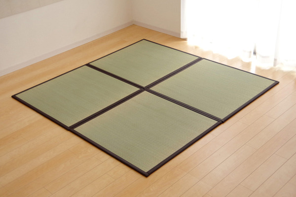 届いたユニット畳を床に置くだけで和のスペースが出来上がります。表生地には国産(九州産)のい草を使用しています。い草には空気の自然浄化作用、湿度の調節作用などがあります。また汚れにくく、使用するうちに黄金色に変化し、味が出ます。中材には10mmの硬わたを使用し、裏地には滑りにくいウレタンフォームを使用しています。青森ヒバに含まれるヒノキチオールは天然の物質としてきわめて抗菌力が強い成分です(抗菌、防臭効果)。また軽量タイプなので、持ち運び、設置、片づけなども楽にできます。